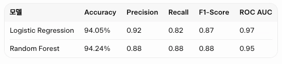 - Logistic Regression과 Random Forest 모델 성능 비교 분석 수행